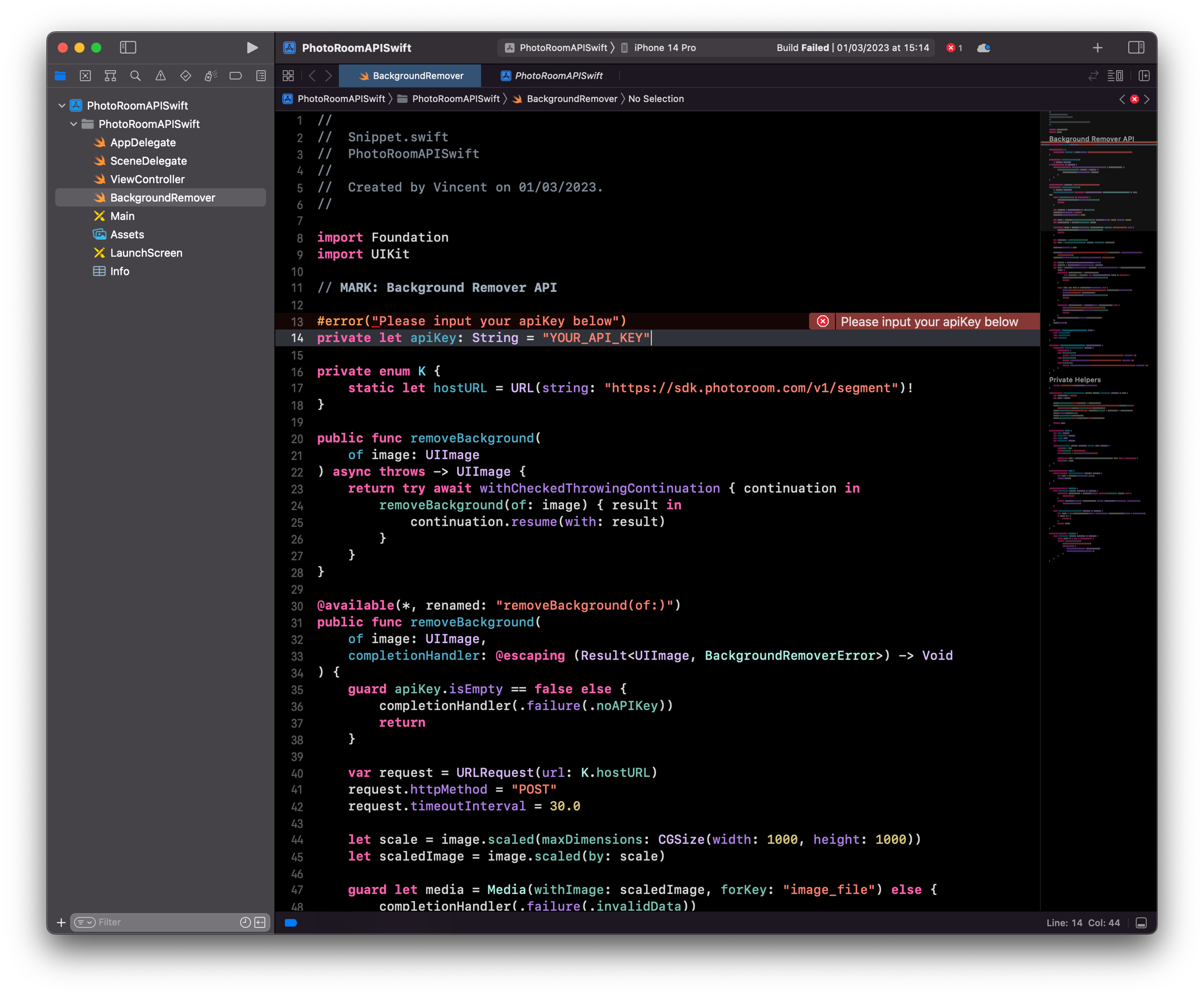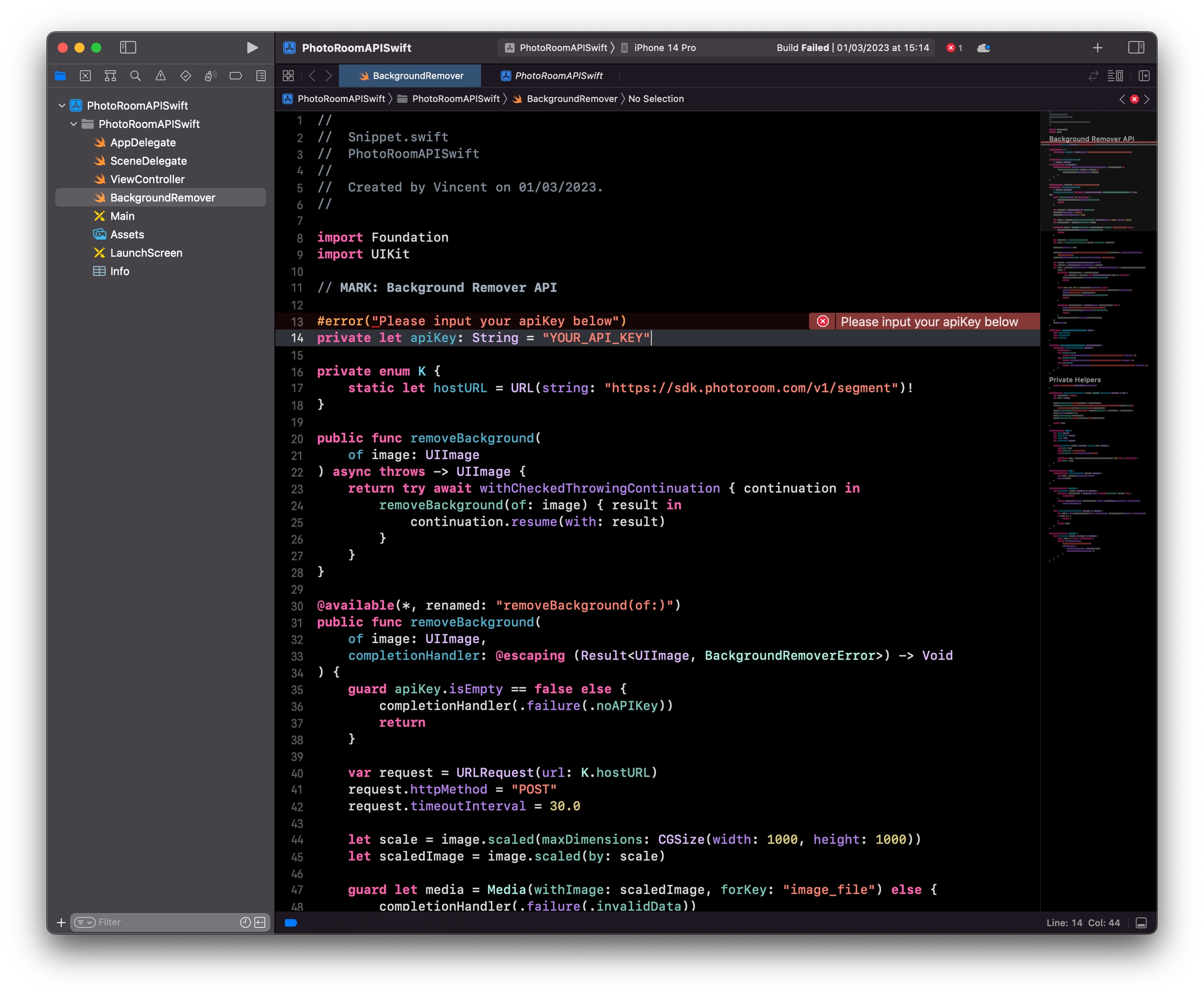 Visit Photoroom’s GitHub to find a sample code that's ready to use. Simply copy and paste the code into your Xcode project, and update the placeholder with your own API key.